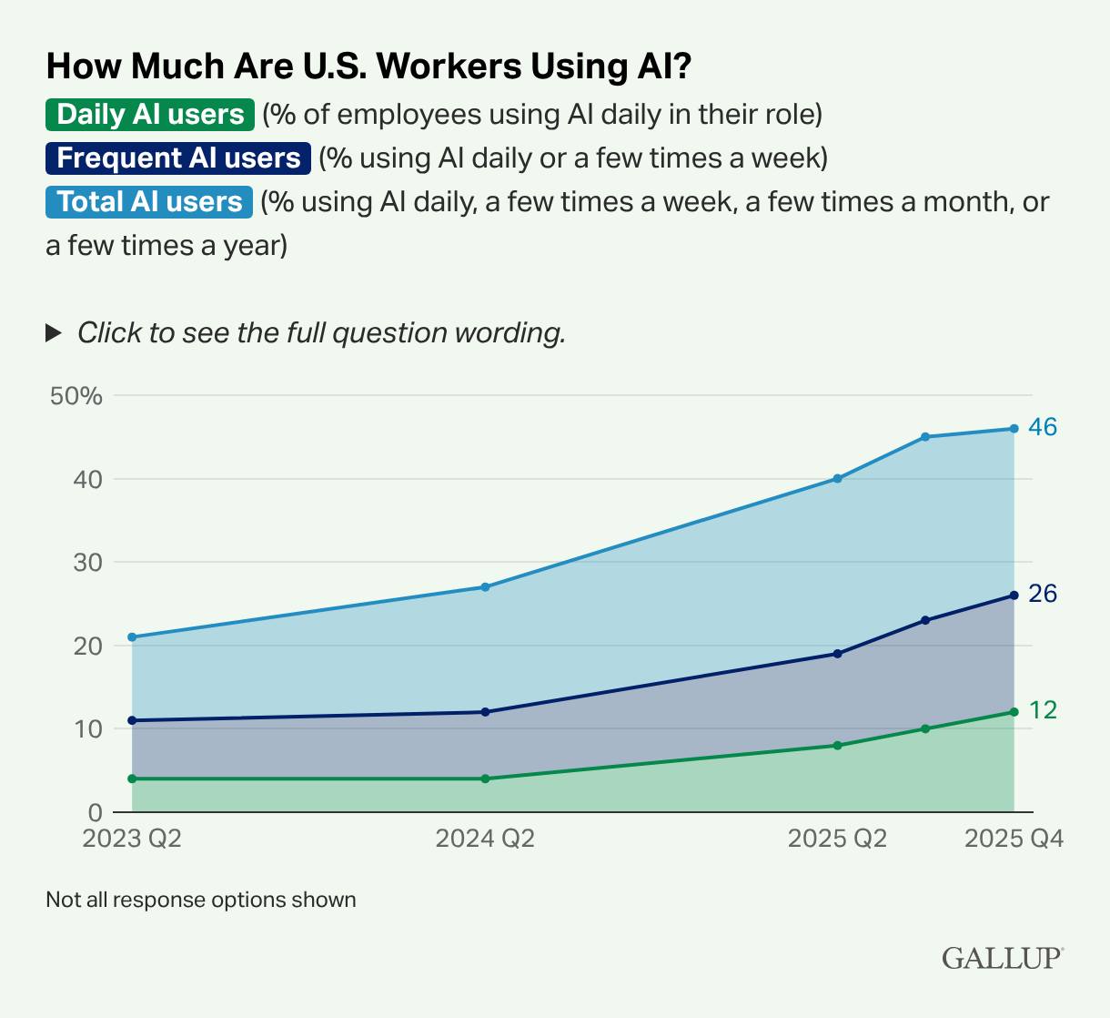 Gallup’s most recent Workforce report quantifies that trend. Among employed U.S. adults, 12% report that they use AI every day, 26% report they use it frequently, meaning at least a few times a week, whereas 49% report that they don’t use it at all in their job.
