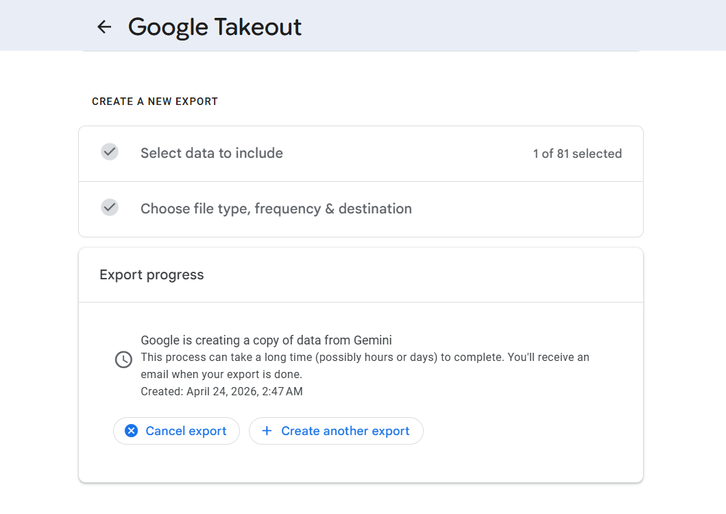 Google will email you a download link when it's ready, usually within 15-30 minutes. The file comes as a ZIP containing your conversation history and any saved personal context.