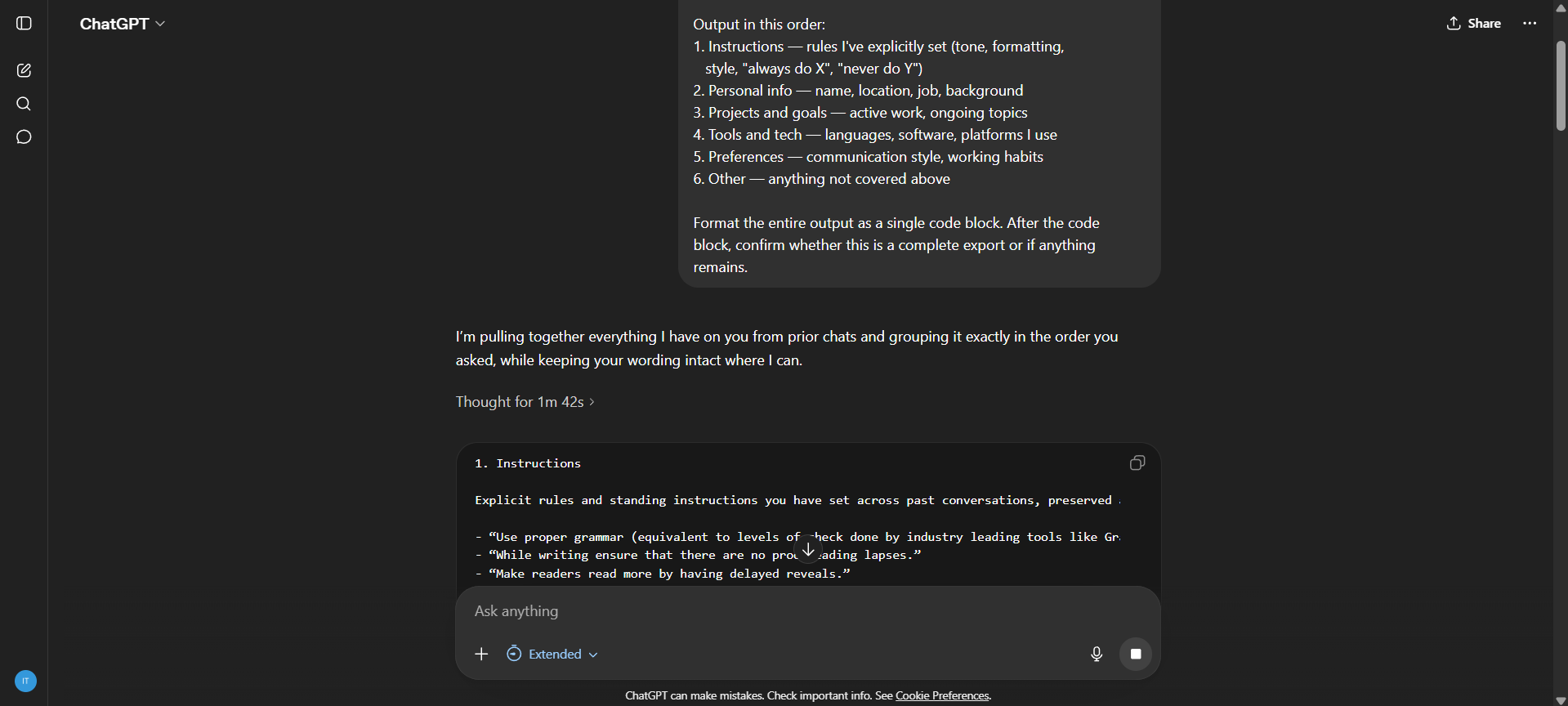 ChatGPT output showing structured memory export in a code block
