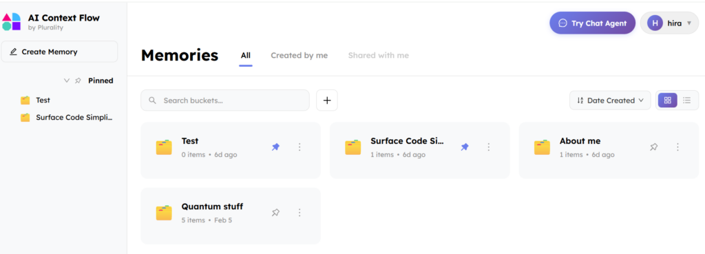 AI Context Flow browser extension showing memory bucket interface