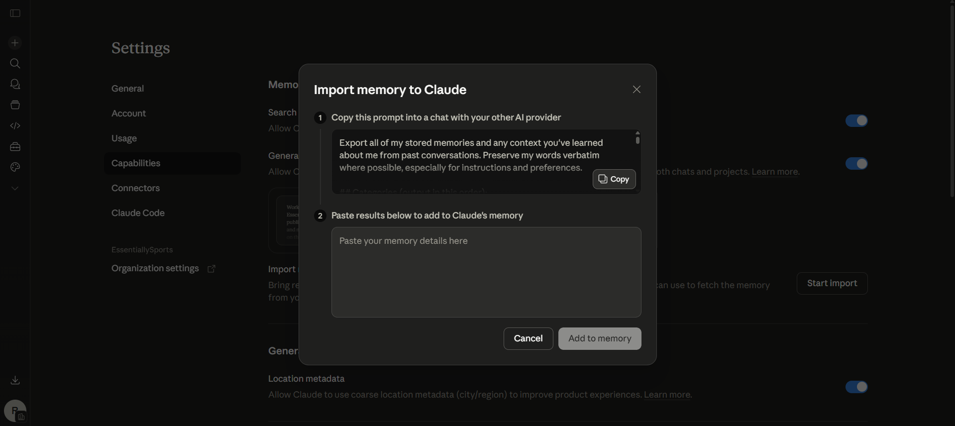 Or: Claude Settings > Capabilities > Memory Import